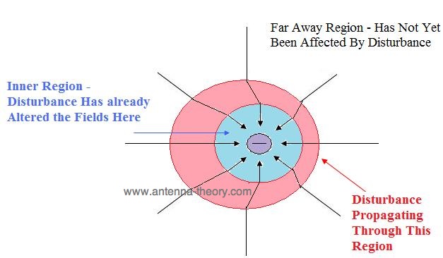 它還決定宇宙(再次無(wú)緣無(wú)故)干擾由于運(yùn)動(dòng)(或加速度)電荷將遠(yuǎn)離充電 – C0 = 300,000,000 m / s的光速傳播。這意味著周圍電荷的電場(chǎng)受到干擾,并且干擾遠(yuǎn)離充電傳播。如圖2所示。