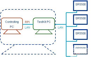 SR5500M提供了RPI接口(Remote Programming Interface)供外部程序控制SR5500M。如圖3所示,SR5500 Testkit軟件所在電腦通過TCP/IP與1臺至4臺SR5500M連接,控制電腦亦通過TCP/IP與SR5500M連接(通常, 可以用一個Switch連接所有設備);控制電腦和SR5500 Testkit軟件所在電腦合并為一臺電腦。