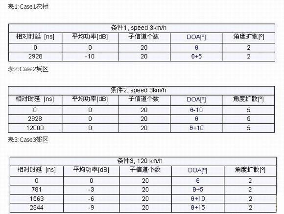 1)多天線解調(diào)測試(靜態(tài)測試):在不同的來波角度(DOA)下測試接收性能。各條徑存在一定的角度擴展,各條徑分別來自不同的角度。驗證在該傳播環(huán)境下接收機的解調(diào)性能。傳播環(huán)境如表1-表3所示。